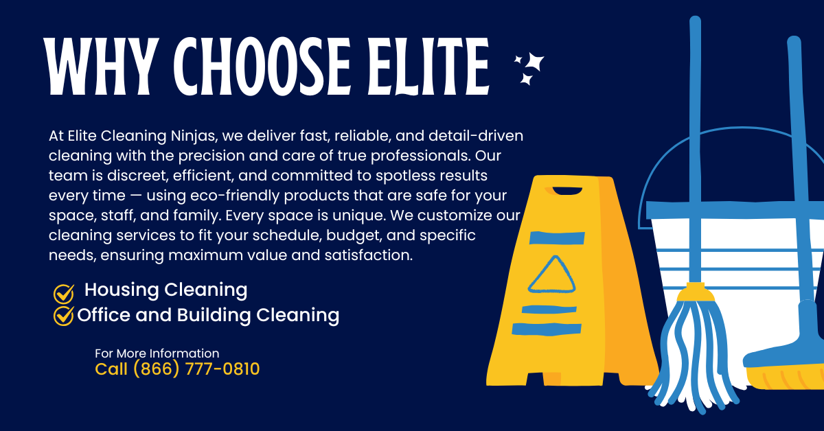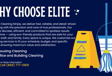 Elite Cleaning Ninjas is a premium cleaning service specializing in professional, detail-oriented cleaning for commercial spaces, dental offices, and businesses that demand spotless results. Combining precision, discretion, and efficiency—just like a true ninja—we deliver high-quality cleaning with a focus on reliability, safety, and excellence. Our black-and-gold brand represents trust, professionalism, and elite standards that set us apart from ordinary cleaning companies..